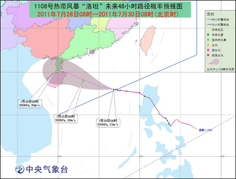 受“洛坦”和西南季风的共同影响,29日08时至30日08时,南海大部、琼州海峡、北部湾、海南沿海、广东中西部沿海及珠江口、广西沿海将有7-8级大风,“洛坦”中心经过的附近海面或地区的风力有9-11级;台湾南部、福建东南部、广东南部、广西南部、海南等地将有大到暴雨,其中广东中西部沿海及雷州半岛、海南有大暴雨,雷州半岛和海南北部的部分地区有特大暴雨.