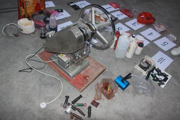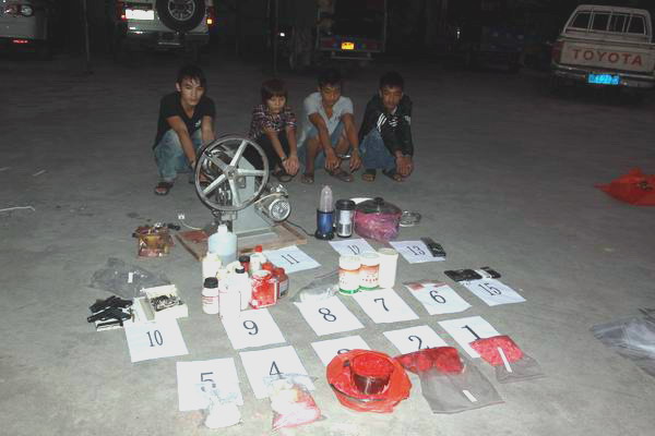 前日,县公安局霞洞派出所联合刑警四中队经周密部署,成功捣毁一个位于霞洞镇浮山岭米头坡水电站废弃工房内一毒品制造工场,当场抓获制毒疑犯3名,吸毒人员1名,缴获毒品“麻果”成品与半成品共约23.37公斤、仿六四式手枪2支、子弹5发、管制刀具2把、制毒工具等物品一批。