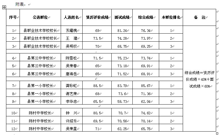 1 县职业技术学校校长 苏耀槐 69 81.24 76.34 1 综合成绩=资历评价成绩×40%+面试成绩×60%