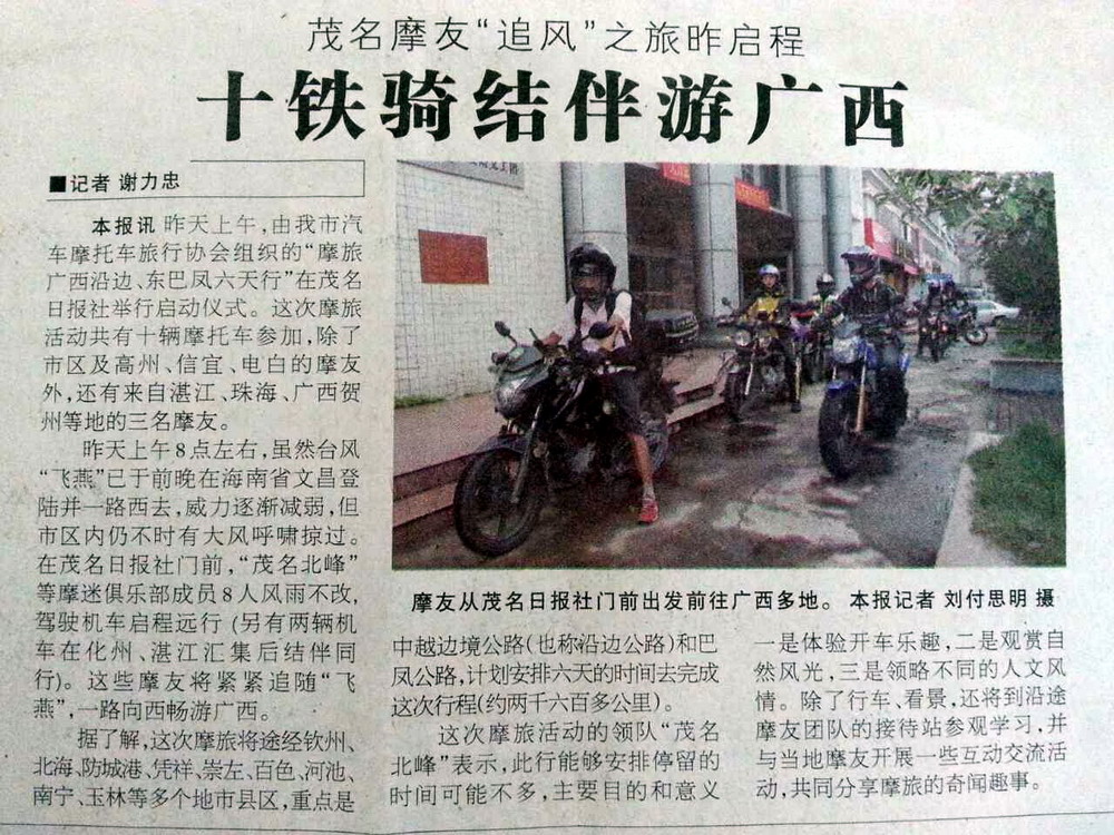 为了进一步活跃“人人参与、感受快乐”的摩旅氛围,茂名市摩托迷俱乐部计划召集约伴,挑选10位摩友组队(车队由10辆摩托车组成)于2014年7月5日出发,到广西玉林、贵港、来宾、柳州、桂林等地开展为期7天的自费参观学习,设计行程约2000多公里,视具体路况及实际情况调整。
