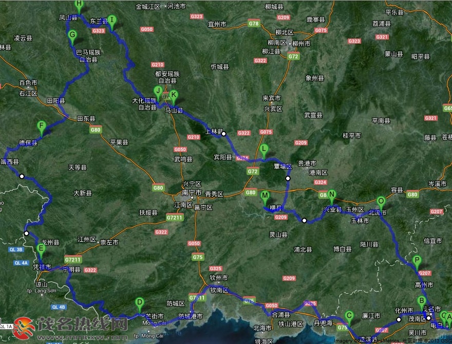 茂名――高州――北流――玉林――贵港――武宣――柳州(住),约440公里,车程9小时。