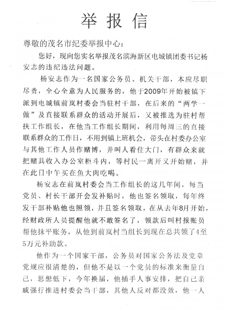 您好,现向您实名举报茂名滨海新区电城镇团委书记杨安志的违纪违法问题。