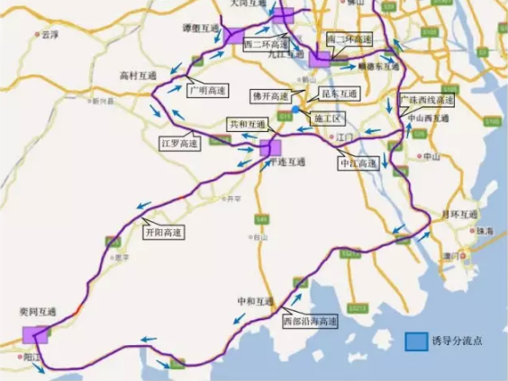 通过广州绕行西环高速公路、南二环高速公路、广珠西线高速公路、广明高速公路、江罗高速公路、开阳高速公路、西部沿海高速公路进行诱导分流。如下图: