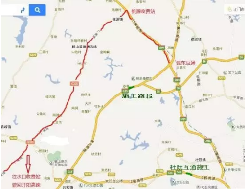 二是绕行地方公路。受江鹤高速杜阮互通施工影响,江鹤高速杜阮路段易出现行车缓慢,建议往粤西(湛江)方向车辆可绕行地方公路,从昆东互通转入江肇高速,从桃源收费站出,绕行325国道,行至水口收费站驶回开阳高速;往广州方向车辆从开阳高速水口收费站出,绕行325国道,行至桃源收费站进入江肇高速,经昆东立交驶回佛开高速。如下图: