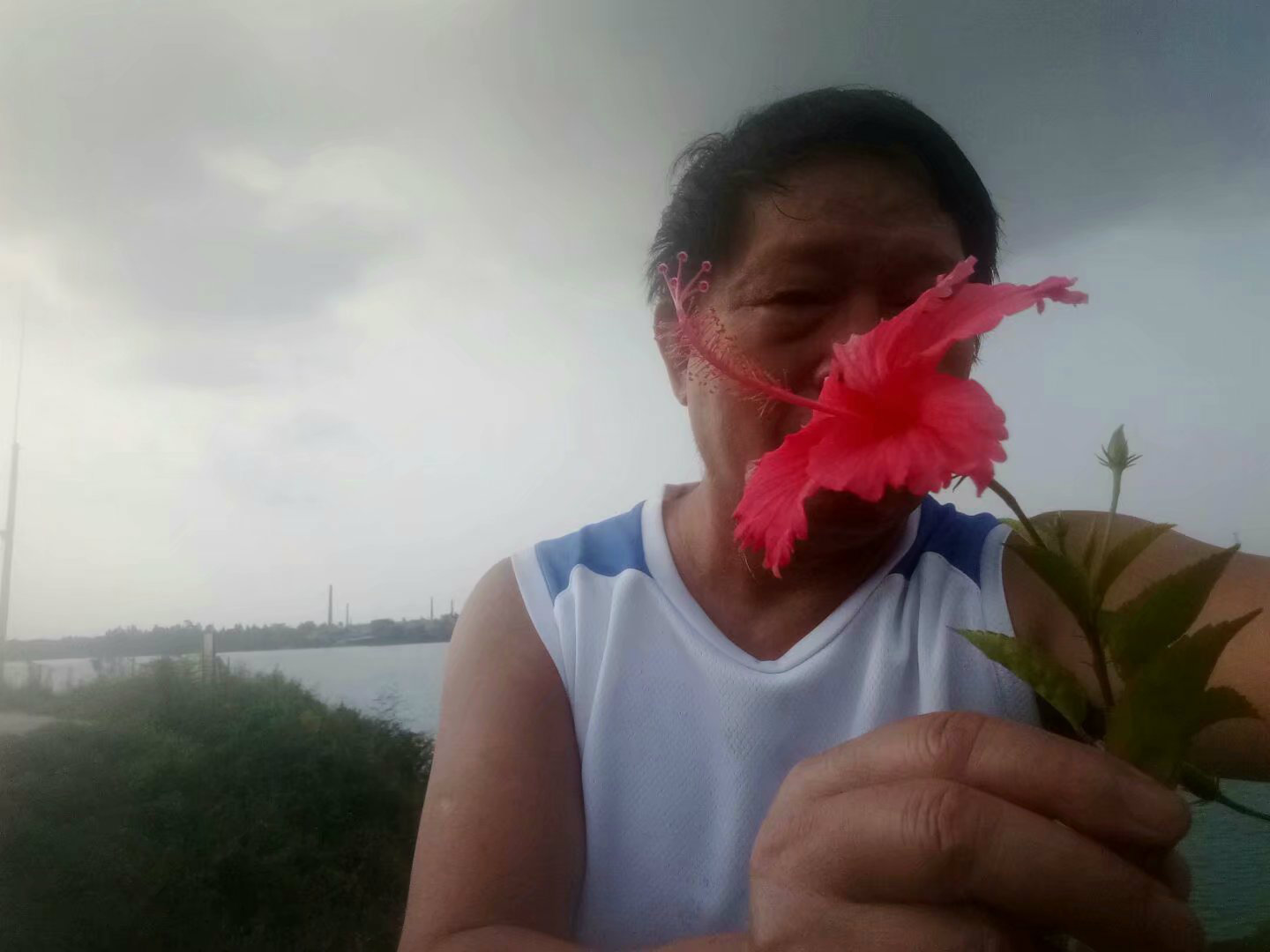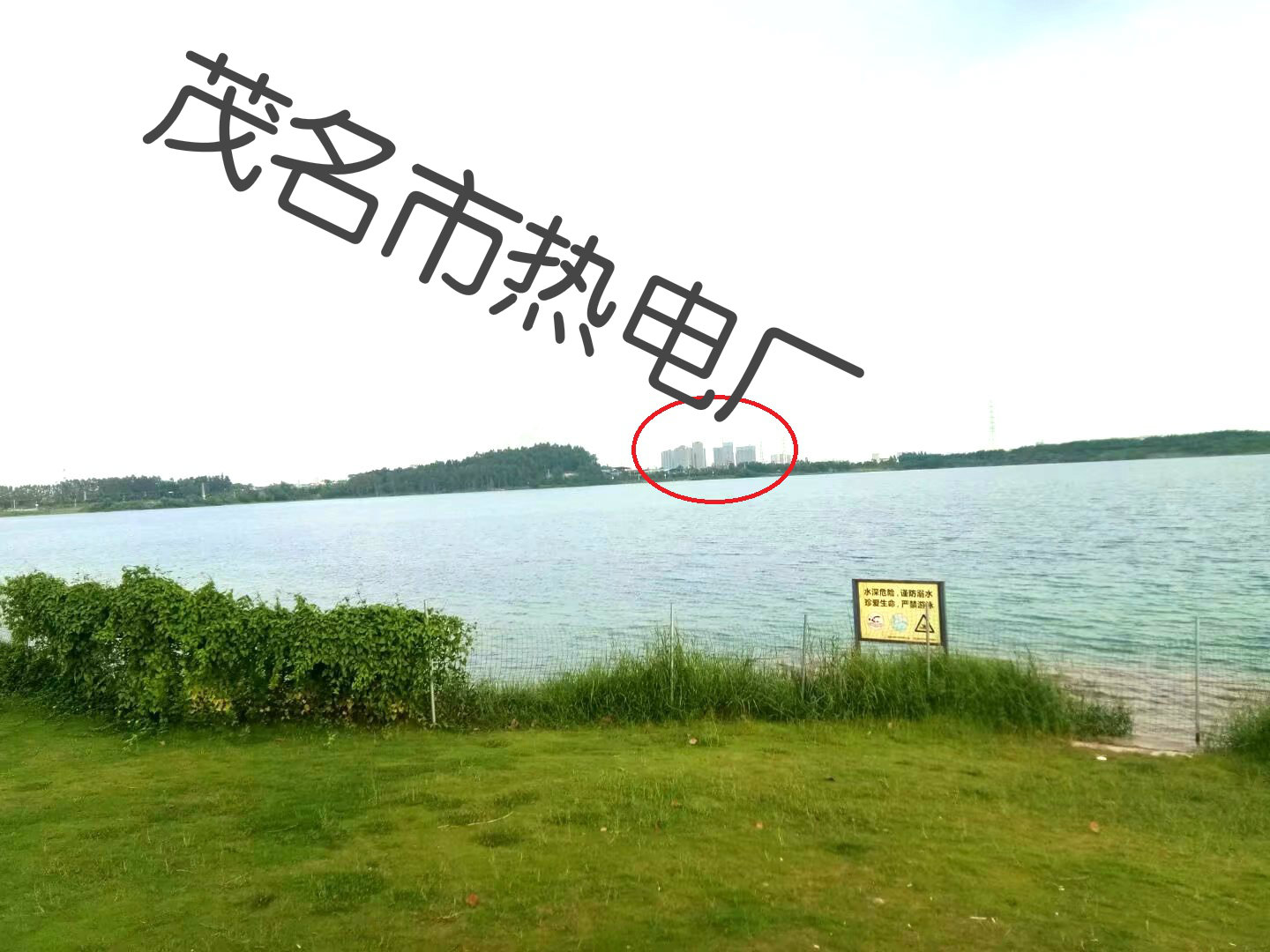 矿湖波光粼粼, 这一片水域较小。对岸是南面茂名热电厂,站在北岸目测直线距离约在3公里以外,电厂冒出的白烟形成烟柱醒目得很。
