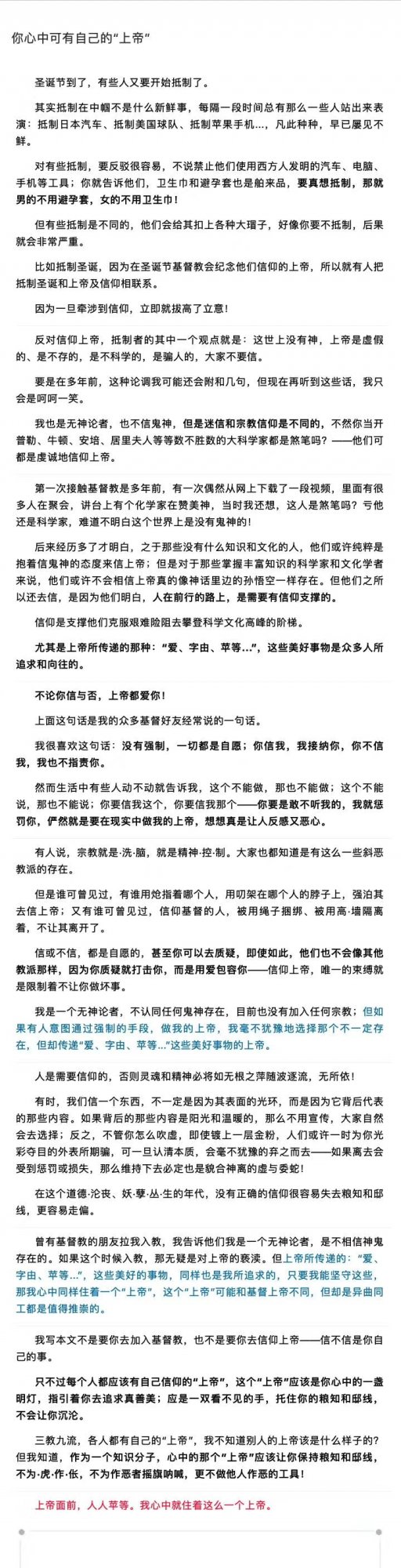 [FONT=宋体]公民有信仰自由,中国人其实就两个信仰,一个是儒家,一个是迷信。至于其它宗教,对于中国人来说,都属于信的不彻底,赶时髦。圣诞节过多是涉外商家的炒作,中国真正的宗教人士属于极少数,对与中国人来说,价值观比宗教重要,不同的时期有不同的价值观,改革开放之后信仰,价值观空白了30年,导致思想领域问题多多,说实话意识形态的入侵是很可怕的,客观的说对手很强,而我们又对此估计不足,问题是比较严重的,好在我们现在意识到了,只要意识到了,就不晚,毕竟我们的文明也很强悍![/FONT]