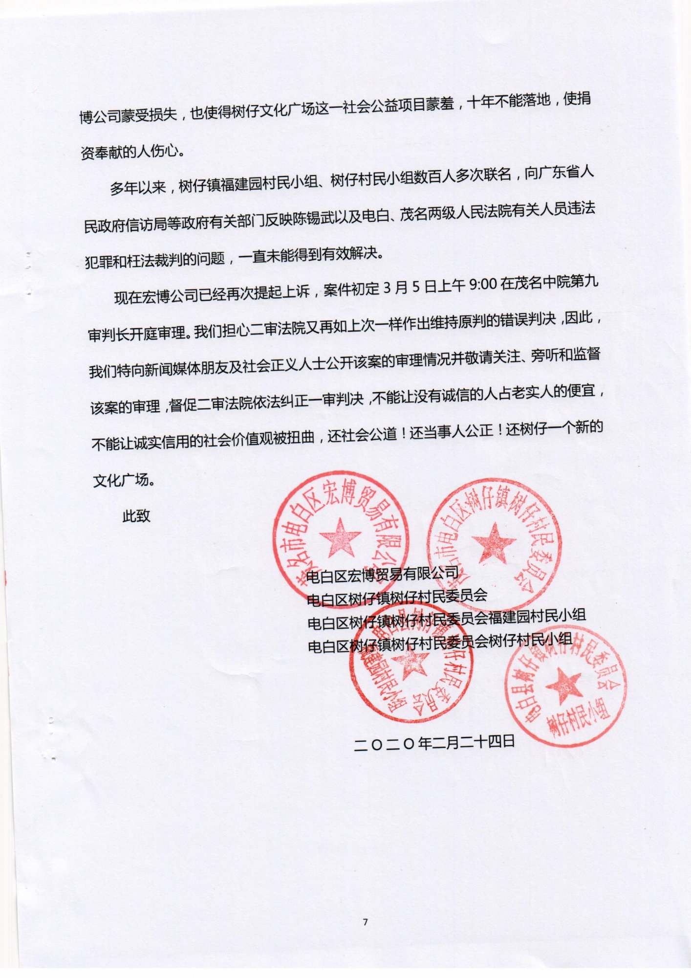 现在宏博公司已经再次提起上诉,案件初定3月5日上午9:00在茂名中院第九审判长开庭审理。我们担心二审法院又再如上次一样作出维持原判的错误判决,因此,我们特向新闻媒体朋友及社会正义人士公开该案的审理情况并敬请关注、旁听和监督该案的审理,督促二审法院依法纠正一审判决,不能让没有诚信的人占老实人的便宜,不能让诚实信用的社会价值观被扭曲,还社会公道!还当事人公正!还树仔一个新的文化广场。
