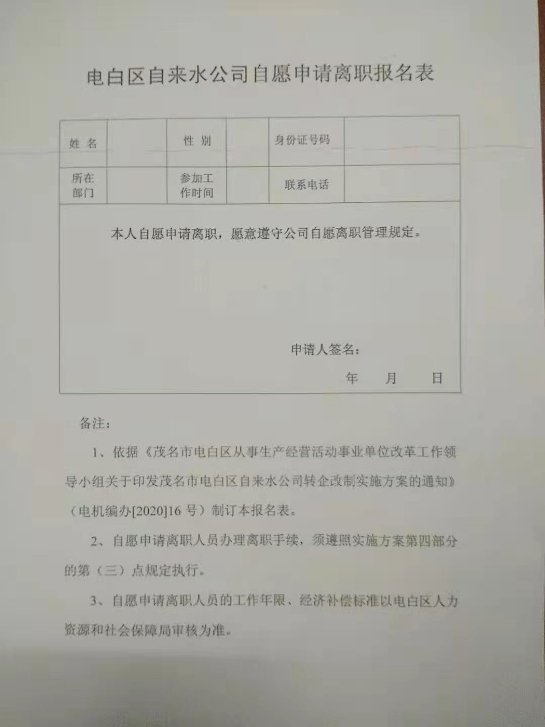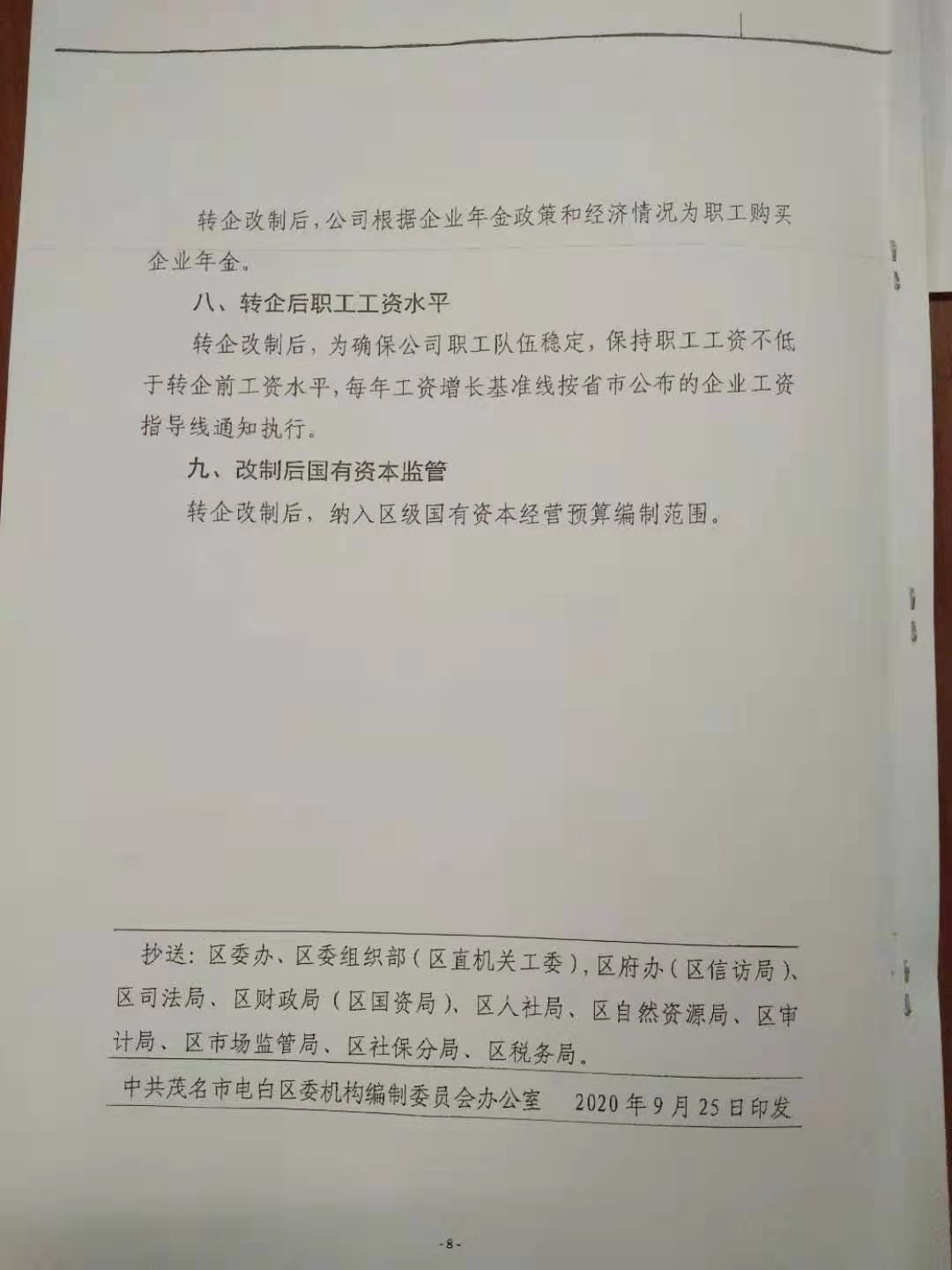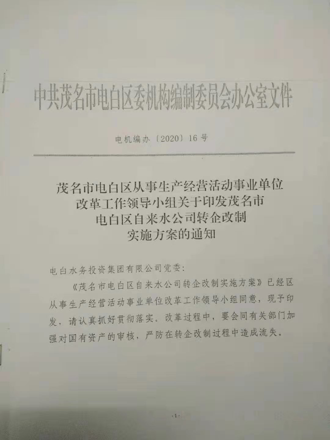 茂名市大电白区所存的事业单位里唯一响应国家政策。事业单位改为企业!事出有因:因在2014年咱们的已升迁刘区长已把电白区自来水公司偷偷承包给了北京首创集团!开始做出几个破产方案来赔偿给职工。可刚好国家来个事改企政策,这可正好借这个处理!