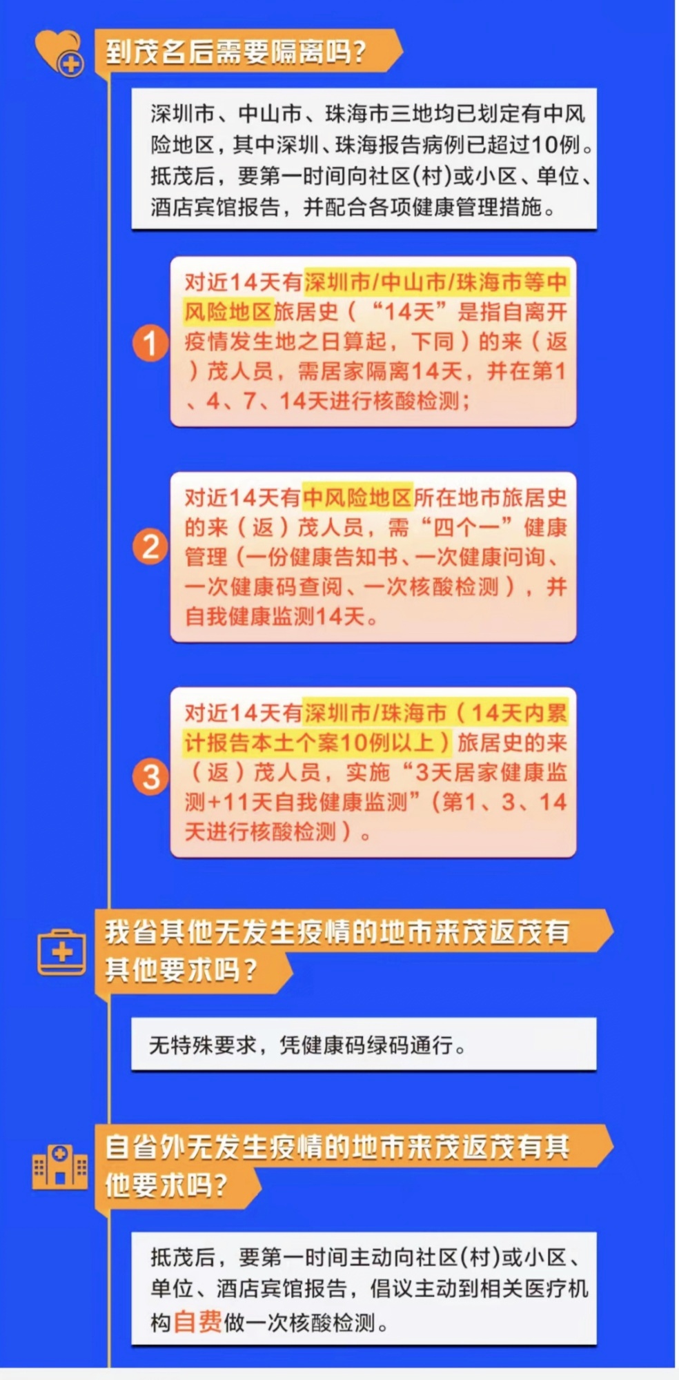 前天茂疾控有新公告:深圳,珠海,中山回电白的,要居家隔离14天,并在第1,3,7,14天做核酸。