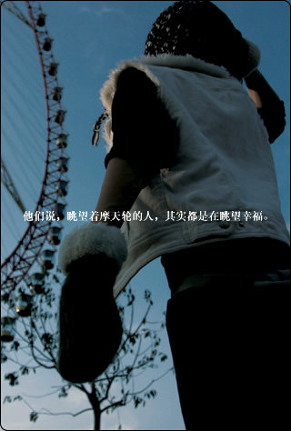 t君na 高中一年级 注册 2006-07-04 消息 562 反馈评分 0 点数 0 年龄 35 2006-10-31 #7 从前,在一个森林里有一座幸福摩天轮。相传只要和你心爱的爸爸、妈妈、知己或者恋人坐上去以后就会被幸福的光芒笼罩着,但是这道给人带来幸福的光芒是无法用肉眼去看的,只能够用新去体会。 不幸的一个小孩,名叫开心。他的爸爸妈妈早已逝世,年纪小小的他没有生存技巧,靠的只不过是到处流浪当乞丐讨回来的钱生活。 有一次,他就流浪到一个叫幸福的城市,并且听说在森林里的幸福摩天轮的传说,于是他便好奇地走进了森林。他站在幸福摩天轮前看着摩天轮里的人脸上的笑容,有的只是羡慕。虽然传说里说要幸福就只能跟心爱的人坐在摩天轮里,但是开心他还是想到摩天轮里坐一坐。他自个儿地坐在摩天轮里,觉得自己孤零零的真的很不幸,只得看着别人一脸的幸福。 ――这时,他看见坐在自己前面的厢里的是一个大约15岁的小伙子和父母。爸爸紧紧地搂着孩子跟妻子,而妈妈用她那温暖的手抚摸着孩子,三人都从心底里发出了灿烂的笑。而他现在想起的是他那亲爱的爸爸妈妈,回忆起父母逝世前的欢乐时光还有点伤感。于是,他省得自己不开心,所以就转过身来看看后面的厢。而他看到的是一对好朋友有说有笑的,聊得可高兴了,有时候笑声还传到他那里去。 看到这情景,他更感觉到自己是那样的孤立无援。一滴委屈的泪水就这样从伤心的眼睛流了下来,滴在自己肮脏的手上。然而,当他再次抬起头来的时候,竟然惊奇地发现他过世的父母坐在自己面前。看着这奇迹,他更是开心得哭了。这个时候的他流的是幸福的泪水,同时也感觉到自己是那样的幸福,仿佛真的感到有一道幸福的光芒笼罩着,心里似乎翻起了波涛大浪,根本无法平静下来。就当他想要投进妈妈的怀抱时,双亲却又惊奇地消失了。但是,父母的无影无踪并没有令他的心情从高潮一下子跌入万丈深渊,反而使他更加的幸福,因为他之前的幻想除了让他觉得自己无比幸福外,现在他还真正领略到这个幸福摩天轮的含义了。 其实,这个幸福摩天轮并不是有莫大的能量能够令所有人感到幸福,真正幸福是在于你跟什么人坐在幸福摩天轮里。只要只有你跟你心爱的人坐在幸福摩天轮里,那么整个空间似乎就只属于你们,没有人干扰,可以尽情地享受着这种感觉,尽情第对对方说出心里话,这难道不是幸福的时光吗? 自此以后,开心决定不再流浪了,他要在这个城市定居下来,因为有幸福摩天轮和爸爸妈妈陪着他,他再也不觉得孤独了,而是那样的幸福,他知道爸爸妈妈没有离开,他们永远都活在自己心中。