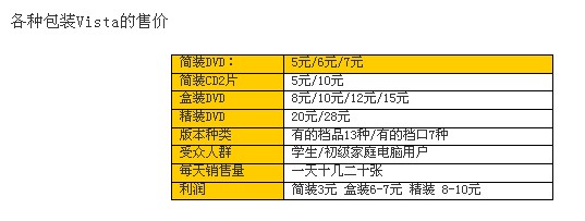 前面我们历尽千辛万苦调查出了多种不同的盗版Vista的版本情况,那这些版本的售价分别是多少呢?有多少人购买呢?买的主要是什么样的人?店主毛利丰厚吗?这些问题我们都一一做了详细的调查,结果如下: