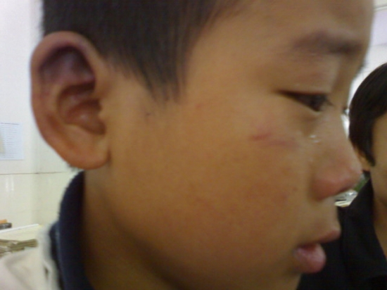 (那一次我们看到了,第二天来上学时,孩子的眼睛成了熊猫眼,鼻梁歪了,脸上伤痕累累!)