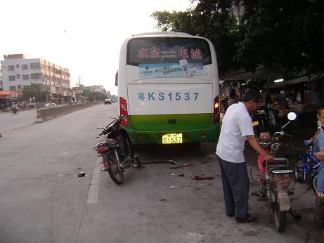 电城至水东中巴客车,下午17:30分左右,电城至水东方向行驶,因车速较快,该路口恰好是中心小学路段路口,星期日的下午就是学生正好乘车到水东读书,中巴客车为了拾客,车速较快,忽然急刹车,拾客,后面有辆老年人驶着摩托车向中巴车的后面撞去。