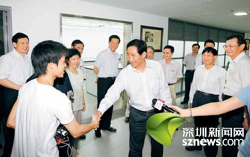 在深圳大学党委书记江潭瑜、校长章必功的陪同下,市领导一行来到深圳大学科技楼,考察了物理、自动化和电子等公共实验室,了解实验室建设和教学情况。近年来,深圳大学注重教学与科研相结合,以增强学生科学素养为目标创新教学体系,每年投入1亿元用于本科实验室建设,将所有实验室定位于对学生实践能力和创新能力的培养,实验室条件已达到国际一流水平。看到公共实验室设备先进,实验教学功能齐全,刘玉浦充分肯定了深大这一教学思路,认为其符合深圳建设国家创新型城市的需要,有利于培养创新型人才。在与实验室同学们的交谈中,他勉励大家珍惜良好的学习条件,毕业后学以致用,为深圳建设国家创新型城市添砖加瓦。