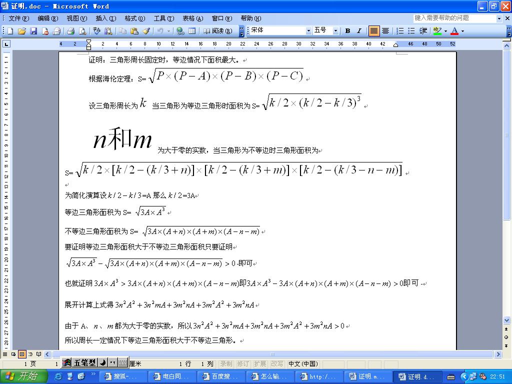 我想证明的不是原题的前提,而是我前面贴子里说的边长固定时什么样的三角形面积最大,我解的也是面积最大的情况,而不是加了前提的最大,一句话,我想说的是没条件的最大,跟贴子里的原题是没有关系的,请不要把我的贴子跟原题连起来。