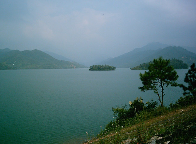 中间有两个天然小岛,浮于水面。大雾笼罩,若隐若现,好似两个披着轻纱,姗姗而来的少女。岛上树木茂密,绿树成荫。温度比周围低6℃,建有别墅、宾馆,成了人们避暑、疗养、会议、旅游的理想场所,库区面积达7000多亩,蓄水量约1.15亿立方米。泛舟遨游水面,朔源而上,尽领略沿途村寨、别墅及环山之层林、奇石、怪岩、流泉、飞瀑风光,犹如进入另一世界之中,愉悦之感油然而生