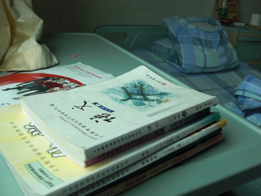我们在燕梅的病床旁的小书桌上,发现了蔡燕梅的课本,面对病魔的缠绕,蔡燕梅并没有向命运低头,她依然努力着,希望能以成绩回报社会,回报所有关心她,爱护她的人