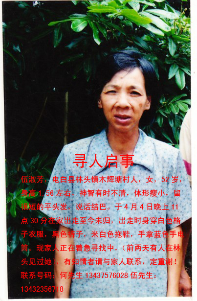 急急……寻人启事,朋友请帮个忙……谢谢 今天听到一个很不好的消息,十几年老同的母亲走失了,知道这事心里很不是滋味。我们虽没有血缘关系,但我们是十几年的同学,如兄弟姐妹般。我身在广州,没能够亲自去寻找,但应该尽自己的心,尽自己的力,如此才能不枉为老同。希望这是虚惊一场,有惊无险。妈妈早日回家…… 各位同学朋友若有这方面的消息请告知,万分感谢…… 详细消息如下: