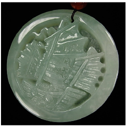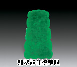 图中的“群仙祝寿佩”,也是王先生的代表作。这件佩长 75 毫米,宽 40 毫米,厚 10 毫米,古琴造型,形制完美。玉佩由两幅开光图景组成,有意思的是前后两个画面内容衔接,就象一幅展开的立轴画卷。题材是王母娘娘寿宴,群仙朝贺的场面。在火柴盒大小的方寸之间,王先生一共雕了十九个人物,不同的造型、体态,甚至不同的表情。这件翠佩如果以今天的市场价衡量,应在两千万元以上。