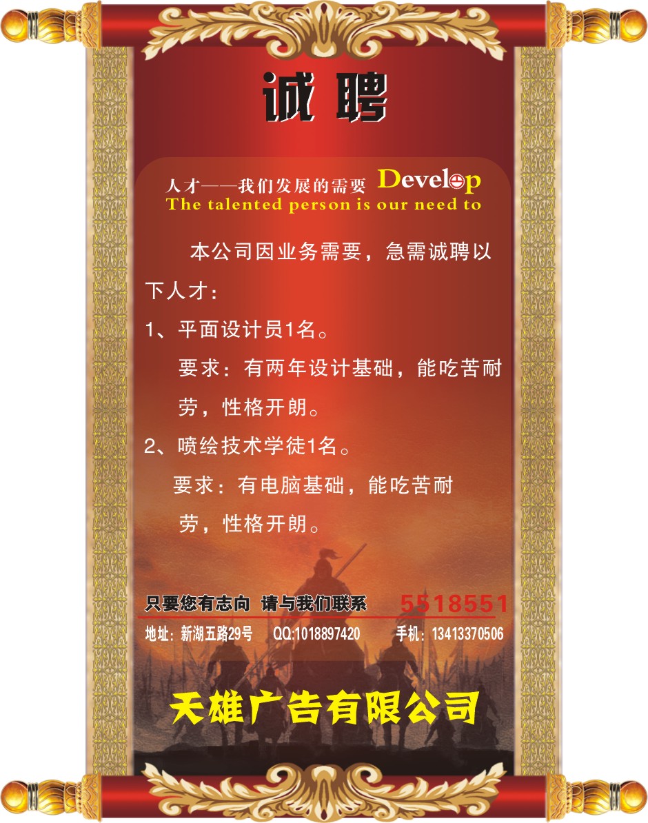 <span style='font-family:'>本公司因业务需要,急需诚聘以 下人才: 1、平面设计员1名。 要求:有两年设计基础,能吃苦耐 劳,性格开朗。 2、喷绘技术学徒1名。 要求:有电脑基础,能吃苦耐 劳,性格开朗。 只要您有志向 请与我们联系 5518551 QQ:1018897420 手机:13413370506 天雄广告有限公司</span>