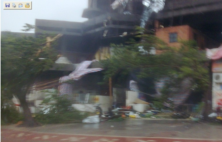 刚才出去转了一下,汇报一下灾情:人民路的很多树木被刮倒,四车道变成双车道了,车站转盘的华润宾馆旁的一个工地有大招牌被打坏,工地围墙倒了,耐克,A迪等专卖店门上面的大喷画被打烂。广告公司请做好大量的设计安装工作!如需做门面广告请速到各广告公司预约!