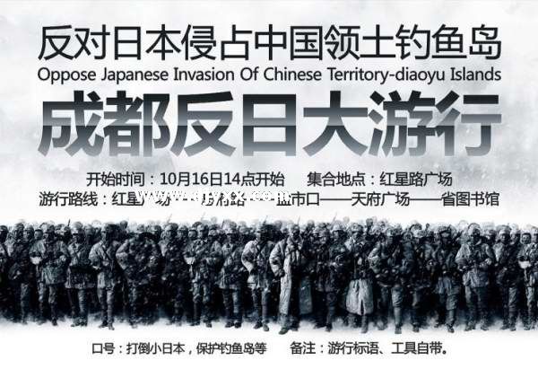本站讯:自前段时间钓鱼岛撞船事件后,上海随即爆发反日游行活动,参与人数众多,民众情绪高昂。近日四川地区网络讯息传播,约定于2010年10月16日在成都举行反日游行活动。6 w! _2 t1 z" i8 I9 I2 D% b& Q 为表达对日本侵占中国领土钓鱼岛以及撞船事件的强烈抗议,成都于2010年10月16日爆发自主组织的反日大游行活动,以下为现场部分图片。 * x! @- y6 ]( a( w