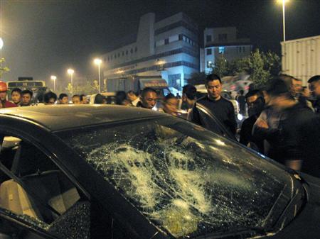 (综合讯)香港媒体报道,中国多个城市昨日爆发反日大示威后,日本驻北京大使馆今日保安明显加强,而四川绵阳市17日下午又有反日游行,示威者向日资车厂掷石。 香港明报网报道,据中国内地的网上指出,绵阳市下午一时许有反日游行,示威者向日资食肆及电器店掷杂物及石块,也有日资车厂生产的汽车玻璃被打烂,警方制止时双方一度冲突。但绵阳市政府否认曾发生游行。 四川成都两家日资百货公司昨日遭抗议人士袭击后紧急关店,今日在五百武警的保护下,百货公司重新开店。 10月17日,在绵阳被示威者破坏的部分日产轿车。(日本共同社)