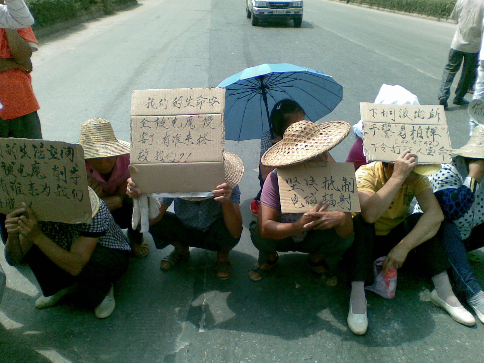 今天中午下班后,经过三角墟电力局时,交通堵塞,开始以为是交通事故,原来是村民示威活动!一群村民举着这种标牌横着坐在公路上!