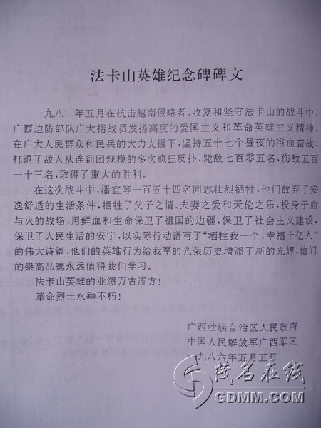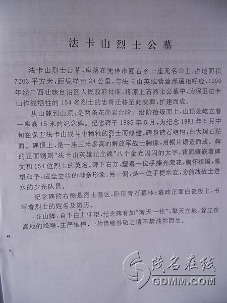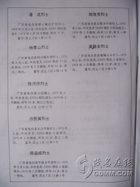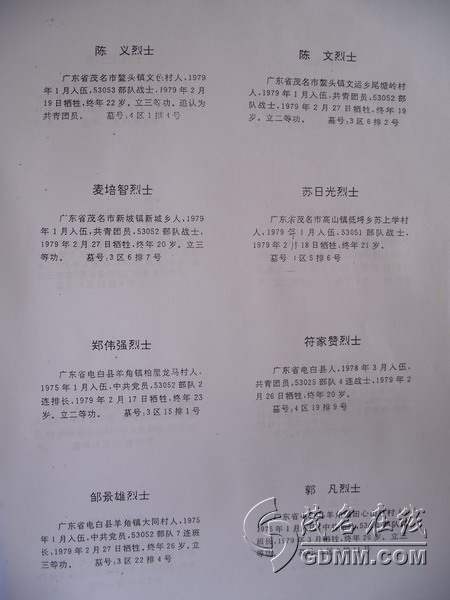 在法卡山英雄纪念碑园,确实没有电白籍的烈士。电白籍的烈士在凭祥市其它烈士陵园都有。我此次不留意遗漏箱机,没有照到其它烈士陵园的图片,抱歉!从别人相机中搜到个别图片。