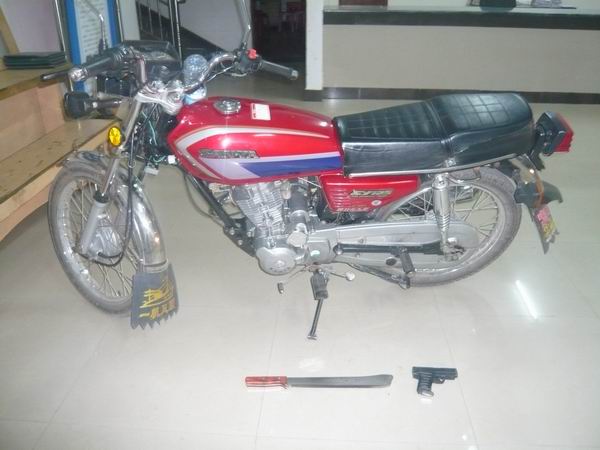 今天下午,岭门派出所通过伏击成功擒获一名现行抢劫疑犯,当场缴获仿真手枪一支、砍刀一把及作案摩托车一辆。