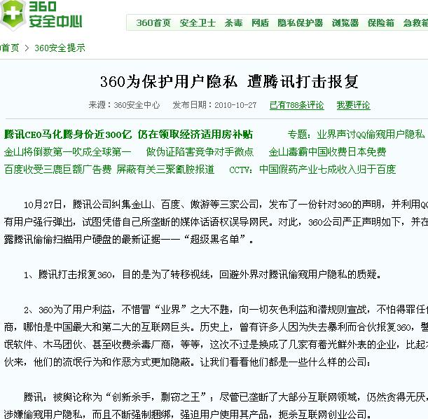 360为保护用户隐私 遭腾讯打击报复