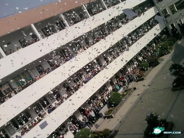 今天,高三所有同学都怒了,爆发了。从下午第一节课下课开始,每个课间所有同学全部从教室出来,拿着撕碎的纸和旧书,全部往楼下扔,有的班甚至直接拿垃圾筐往下倒。起因是某个班(大家都知道)的数学老师由于上级领导的恐吓不得不上课,课上到一半被别的老师看到,叫走了。大家不满学校的做法。