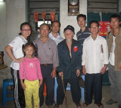 李老今年101岁高龄了,是参加过第一次远征军的老兵,当年历经艰苦从泰国走回家,后来一直在村里当民办教师。见到我们,老人很激动。当我们看到老人右眼长了东西,还没来得及问,老人说:他在等我们来,望眼欲穿,所以眼睛都望坏了。老人的儿子说:“老人抗日的经历一直没法向别人倾诉,憋在心里好多年了,难受!今天,终于可以说出来。”听得我们好一阵心酸。老人很可爱,喜悦之情溢于言表,给我们显露他的十八般武艺,先是敬军礼,喊军号,声音洪亮,颇具军人风采;接着一字不差地背英文字母和唱抗日歌曲;为了证明自己的力气大,逐个跟我们握手比手劲,力气非常大,把Ssherry的手都握出一条明显的甲痕。