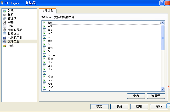 4、设置smplayer:选项->首选项->文件格式->全选->确定。