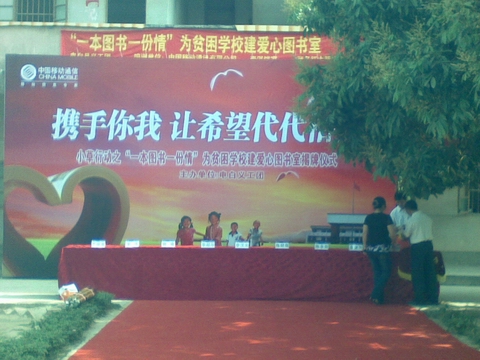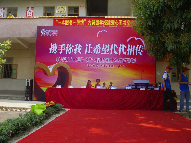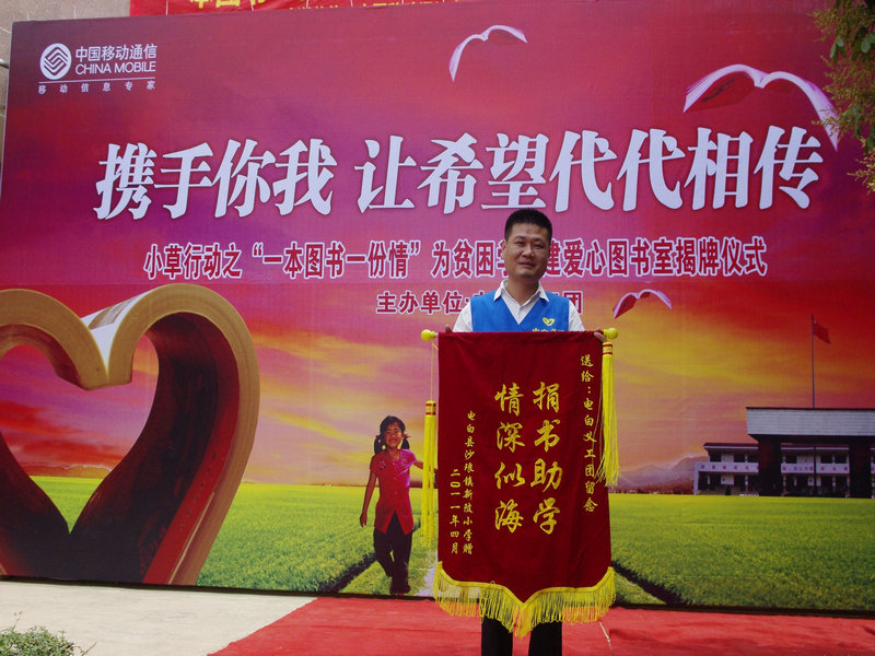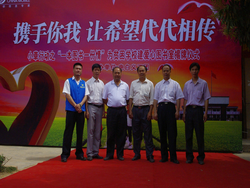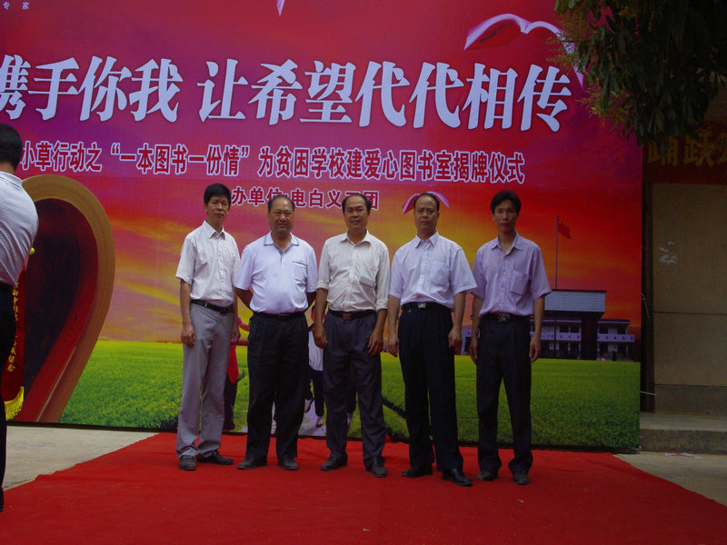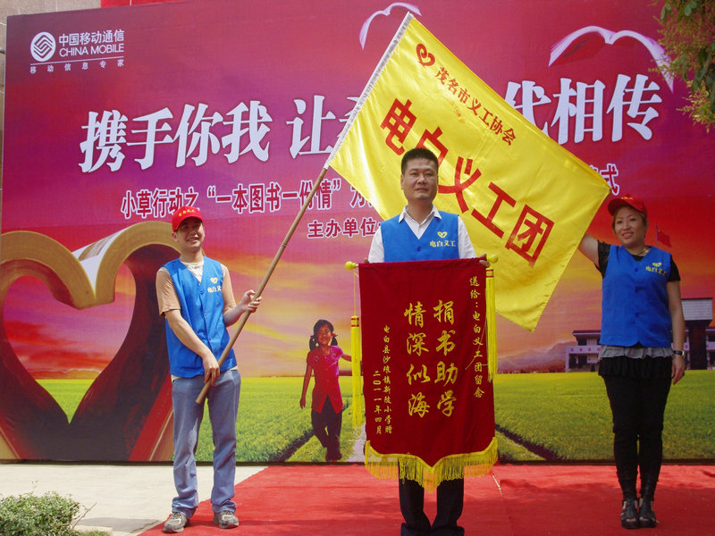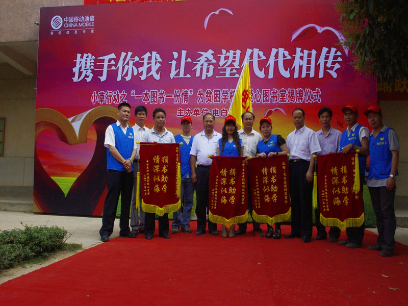 4月26日,电白义工团小草行动之“全球通爱心图书室”揭牌仪式在电白县沙琅镇新陂小学举行,此举标志着由电白义工团首次倡导的小草行动“一本图书,一份情”为山区学校创建爱心图书馆大型公益活动的第1间爱心图书室全面投入使用。小草行动“一本图书,一份情”拟在电白县范围内为贫困地区学校创建爱心图书馆,以帮助山区学校建起自己的图书室。电白县沙琅镇副镇长、中国移动电白分公司、红太阳足疗保健连锁企业,电白义工团等相关负责人出席了揭牌仪式。