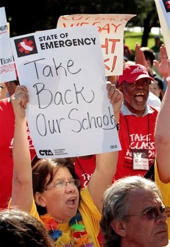 13日,2000多名教师、学生和教育支持者们在加州萨克拉门托州议会前示威游行,反对拟议的预算案对公共教育的大幅削减。来自全州的教师一周来举行了一系列的示威,抗议教育预算消减。