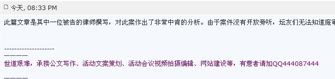 有个疑问。既然案件没有开放旁听,坛友们无法知道庭审的详细情况,其中一位被告的律师撰写的博文,你怎么认定他对此案作出了非常中肯的分析?