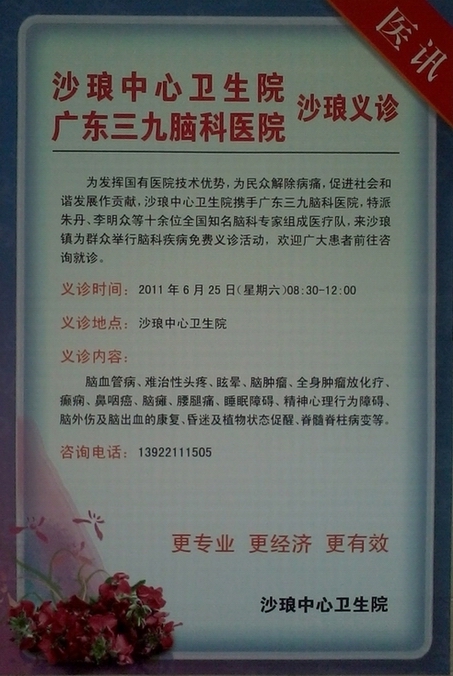 白独行侠 小学三年级 注册 2010-11-25 消息 219 反馈评分 0 点数 0 2011-06-21 #1 2011年6月25日,沙琅中心卫生院携手广东三九脑科医院义诊活动 地址:电白县沙琅镇水东路36号沙琅中心卫生院(电白县第三人民医院) 时间:6月25日(星期六)8:30―12:00 附件 照片008a.jpg 221.9 KB · 查看: 142