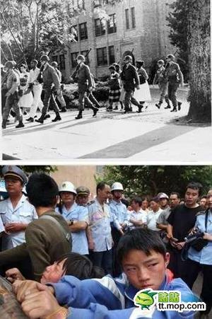 上图是1957年的美国阿肯色州小石城,刚刚取缔种族隔离制度,9名黑人学生仍然被白种学生拒绝接纳,当时美国总统艾森豪威尔将军空降一千名士兵保护黑孩子入学。下图是俺们2010年某次拆迁事件里,本应被保护的孩子,却要以弱小的身躯,去和庞大邪恶的权力阶层对抗!