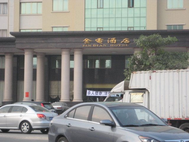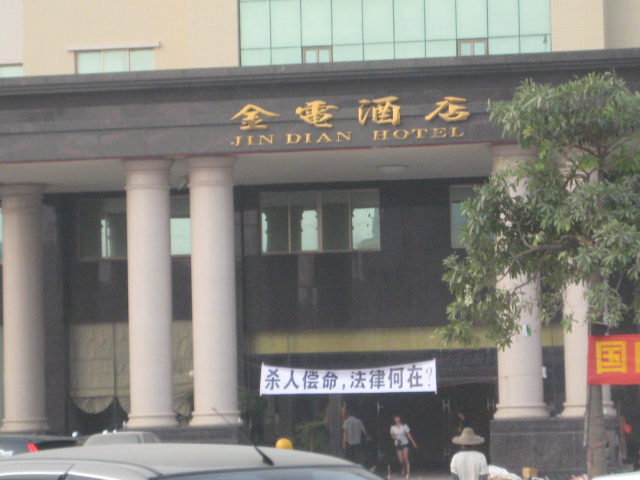 只见:金电酒店门前已停着几辆警车,同时一群社会青年正起劲地敲着洗脸盆;酒店大门口拉着一条横幅,上面写着:“杀人偿命,法律何在?”