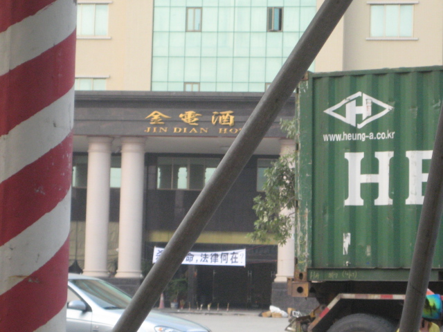 今天下午四点,朋友至电本人:“金电酒店大件事!一大堆人抬着棺材、拉着横幅,正在那里闹得起劲!”