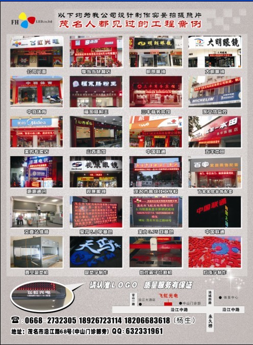 茂名市飞虹光电科技有限公司十一月特推出优惠活动.LED电子显示屏1800元/方,吸塑发光字7元/CM,外露字6元/CM,广告门面招牌设计制作。地址:茂名市沿江路68号(中山门诊部旁边、沿江大厦旁边)欢迎来电询!18926723114/18206683618 杨生