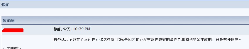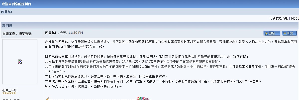 最后跟铁S说句话,虽然你是公安系统安排在本论坛搞“网络问政”,但请你记住你不是公安局安排在这的托儿。我们也不需要托儿,你在本论坛回答网民们的问题不是一次两次口出托词,看了真的令人极其反感。我们需要的是阳光(公开),天枰(公正),实事求是