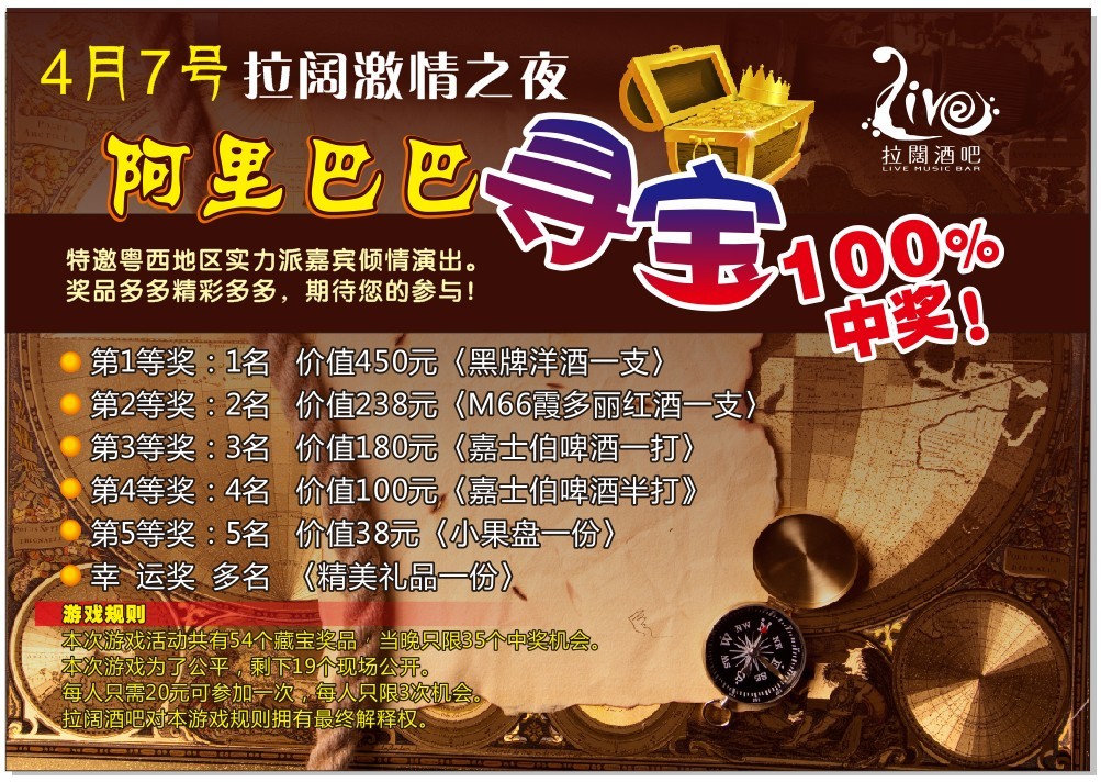 4月7号拉阔酒吧‘激情之夜’啊里吧吧藏宝百分百中奖。