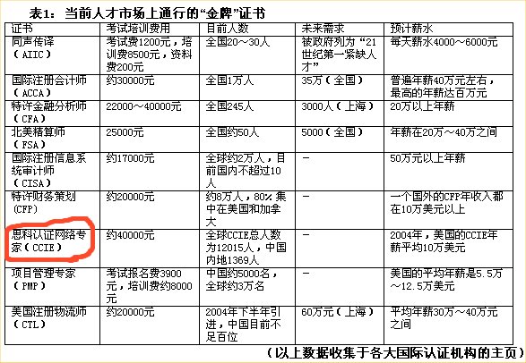 1. CCIE的考试难度大:CCIE的考试分为笔试和实验考试,实验考试难度非常大,必需有8个小时的亲自动手实验操作,完成某个具体的目标,很多人考CCIE的人都是因为实验无法通过.而不能取得CCIE证书