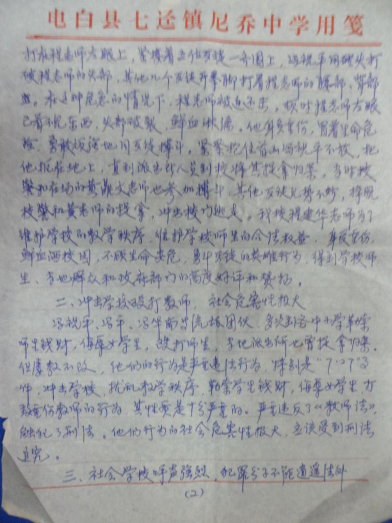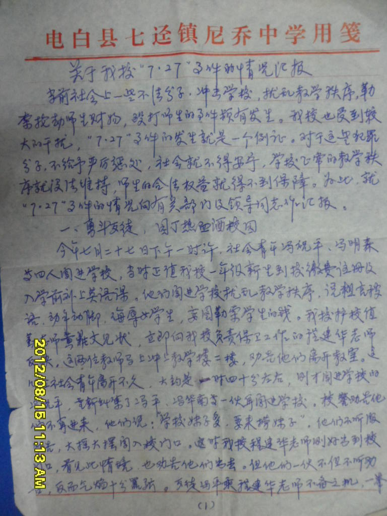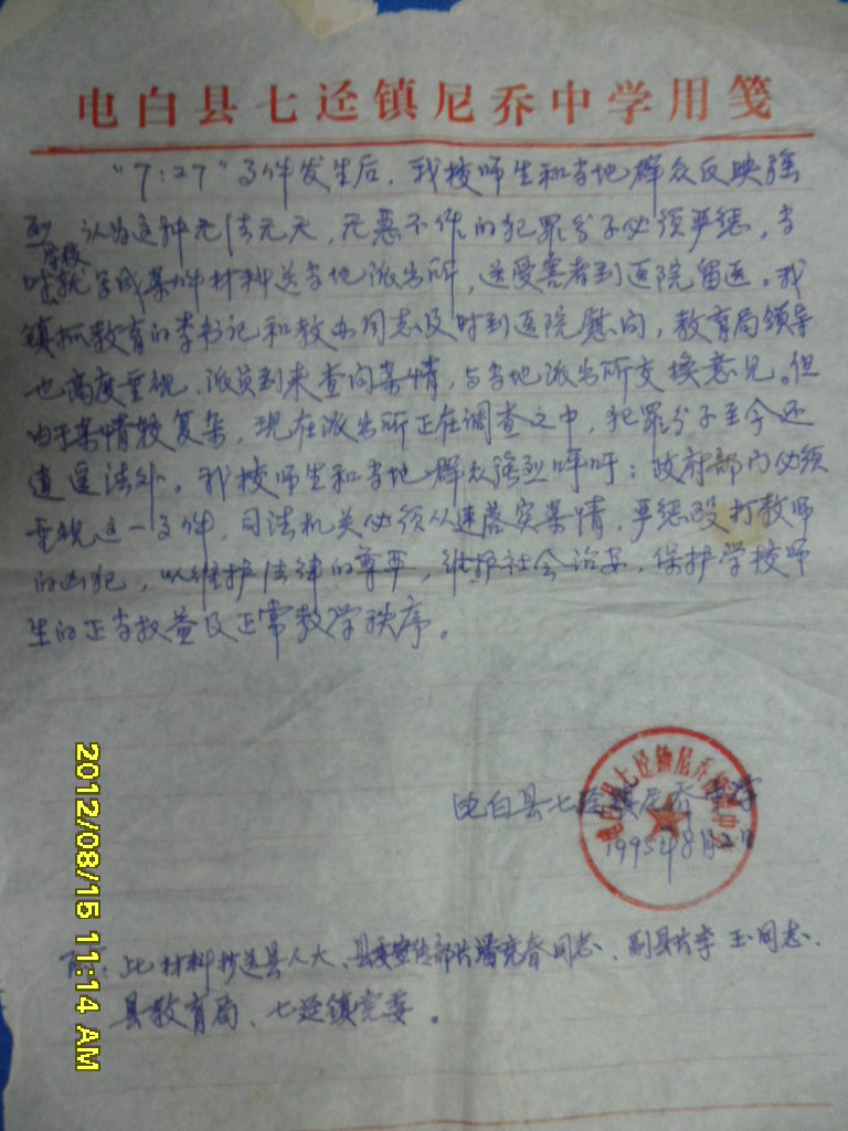 附件,见后(1995年7月27日,我被冯祝平等歹徒群殴致伤后,当时七迳镇尼乔中学向电白县委、县政府的情况汇报)