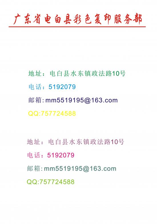彩色复印,质量好、效果佳、速度快,价格优惠,欢迎光临! 本店可进行A3彩色激光复印、A3彩色激光打印,A3彩色扫描说是电白论坛网友,更加特惠 黑白、彩色扫描超快,每分钟70张! 名称:电白县彩色复印店 地址:电白县水东镇政法路10号(旧检察院楼下) QQ:757724588 邮箱:mm5519195@163.com 757724588@qq.com 电话:5192079 附加缩略图