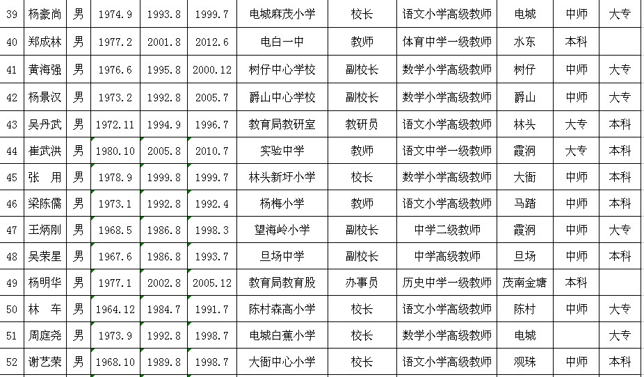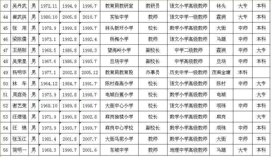 49 杨明华 男 1977.1 2002.8 2005.12 教育局教育股 办事员 历史中学一级教师 茂南金塘 本科