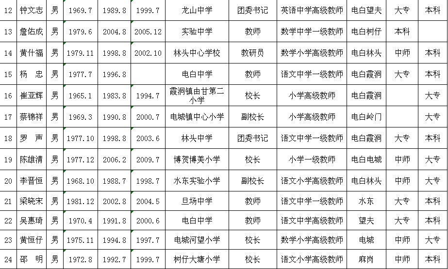 15 杨 忠 男 1977.7 1996.8 电白中学 教师 语文中学一级教师 "电白