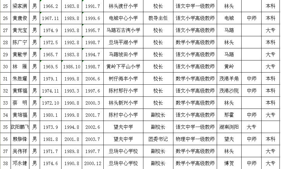 25 梁家满 男 1966.2 1983.8 1991.7 林头渡仔小学 校长 语文中学一级教师 林头 本科